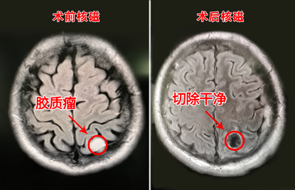 通过晓伟术前、术后核磁影像对比显示,其左侧额顶部位的胶质瘤已经全切